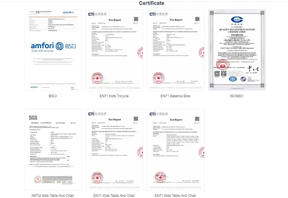 Sertifikasi sepertiEN71DanASTMmenunjukkan bahwa kitasepeda roda tiga anak-anak dan balita karena telah menjalani pengujian khusus untuk mengetahui apakah bahannya tidak beracun, apakah sudutnya akan melukai tangan, dan apakah bagian-bagiannya kokoh, serta telah memenuhi standar keselamatan.